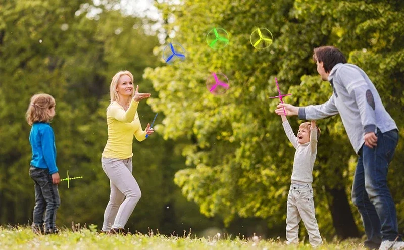 Estímulo Sensorial e Visual: As cores vibrantes das hélices girando e o movimento no ar prendem a atenção e estimulam os sentidos visuais da criança.